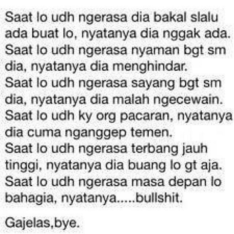 Saat lo udah ngerasa dia bakal selalu ada buat lo, nyatanya dia nggak ada. saat lo udah ngerasa nyaman banget sama dia, nyatanya dia menghindar. Saat lo udah ngerasa sayang banget sama dia, nyatanya dia malah ngecewain. Saat lo udah kaya' orang pacaran, nyatanya dia cuma nganggep temen. Saat lo udah ngerasa terbang jauh tinggi, nyatanya dia buang lo gitu aja. Saat lo udah ngerasa masa depan lo bahagia, nyatanya... bullshit. Ga jelas, bye.